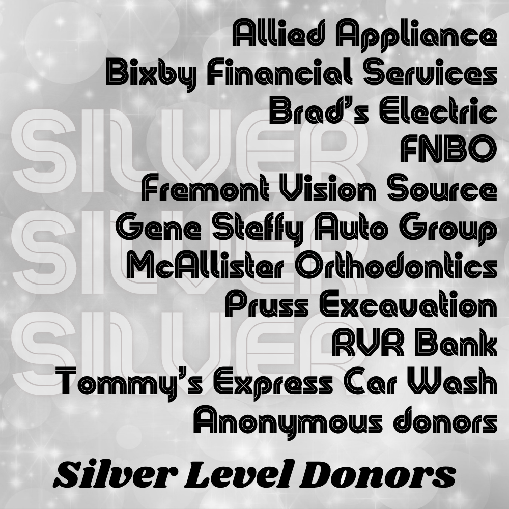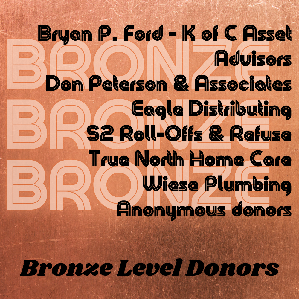 Patrocinadores de Green Level: Pedro Ajanel y Micalea Ticum, Ann's Bookkeeping & Tax Service, Carol Beacom, Doreen Beaudette, Bobette's Home Care, Christensen Lumber, Brian Doernemann, Forest Fuehrer, Margaret J. Hough, Dan & Lynn Juhl, Don Mefford, Tom & Jan Meier, David & Sheila Monke, Steve & Petty Pribnow, Rader Photography, Diane K. Rogers, Natalie Schlaebitz & Patrick Schlaebitz DDS, Lucille Schmit, Rick & Dianne Vyhlidal, Rick & Dianne Vyhlidal, Joseph & Virginia Wojtkiewicz y donantes anónimos