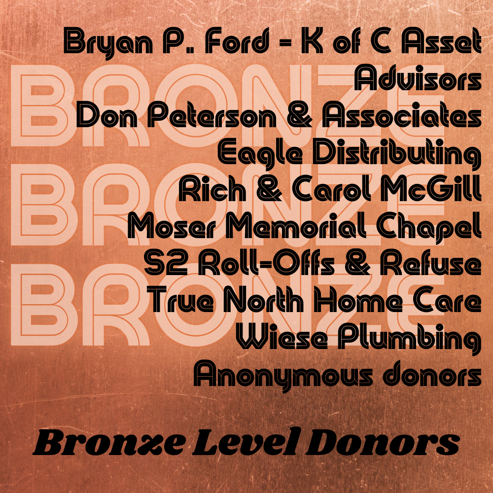 Patrocinadores de nivel verde: Pedro Ajanel y Micalea Ticum, Ann's Bookkeeping & Tax Service, Carol Beacom, Doreen Beaudette, Bobette's Home Care, Christensen Lumber, Brian Doernemann, Forest Fuehrer, Mary Granger, Deacon Vic y Cathy Henry, Margaret J. Hough, Sr. y Sra. Justin Jelinek, Dan y Lynn Juhl, Alan Kassmeier, Don Mefford, Tom y Jan Meier, David & Sheila Monke, Steve & Petty Pribnow, Rader Photography, Diane K. Rogers, Natalie Schlaebitz & Patrick Schlaebitz DDS, Lucille Schmit, Rick & Dianne Vyhlidal, Joseph & Virginia Wojtkiewicz y donantes anónimos
