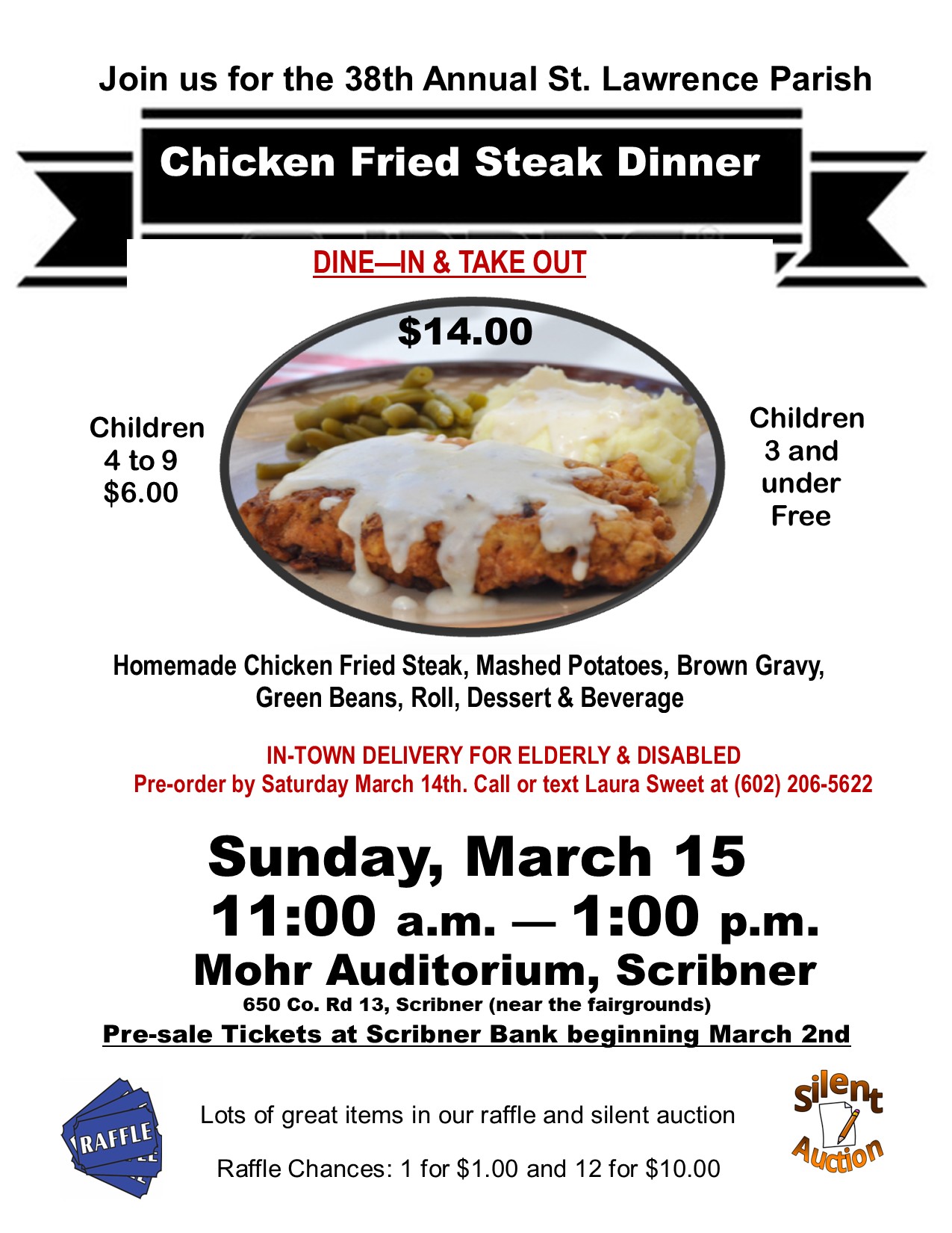 Support our sister parish, St. Lawrence, at their annual chicken fried steak dinner! You can dine-in or carry-out Sunday, March 15th 11a-1p at Mohr Auditorium in Scribner. This delicious meal includes chicken-fried steak, mashed potatoes, brown gravy, green beans, roll, dessert & beverage for $14 (children 4-9 eat for $6 and kids 3 and under eat free).